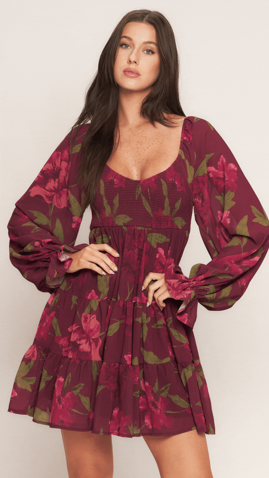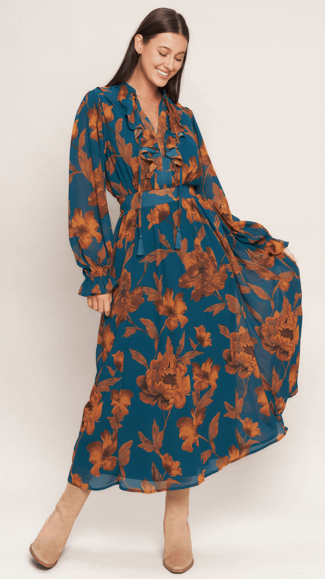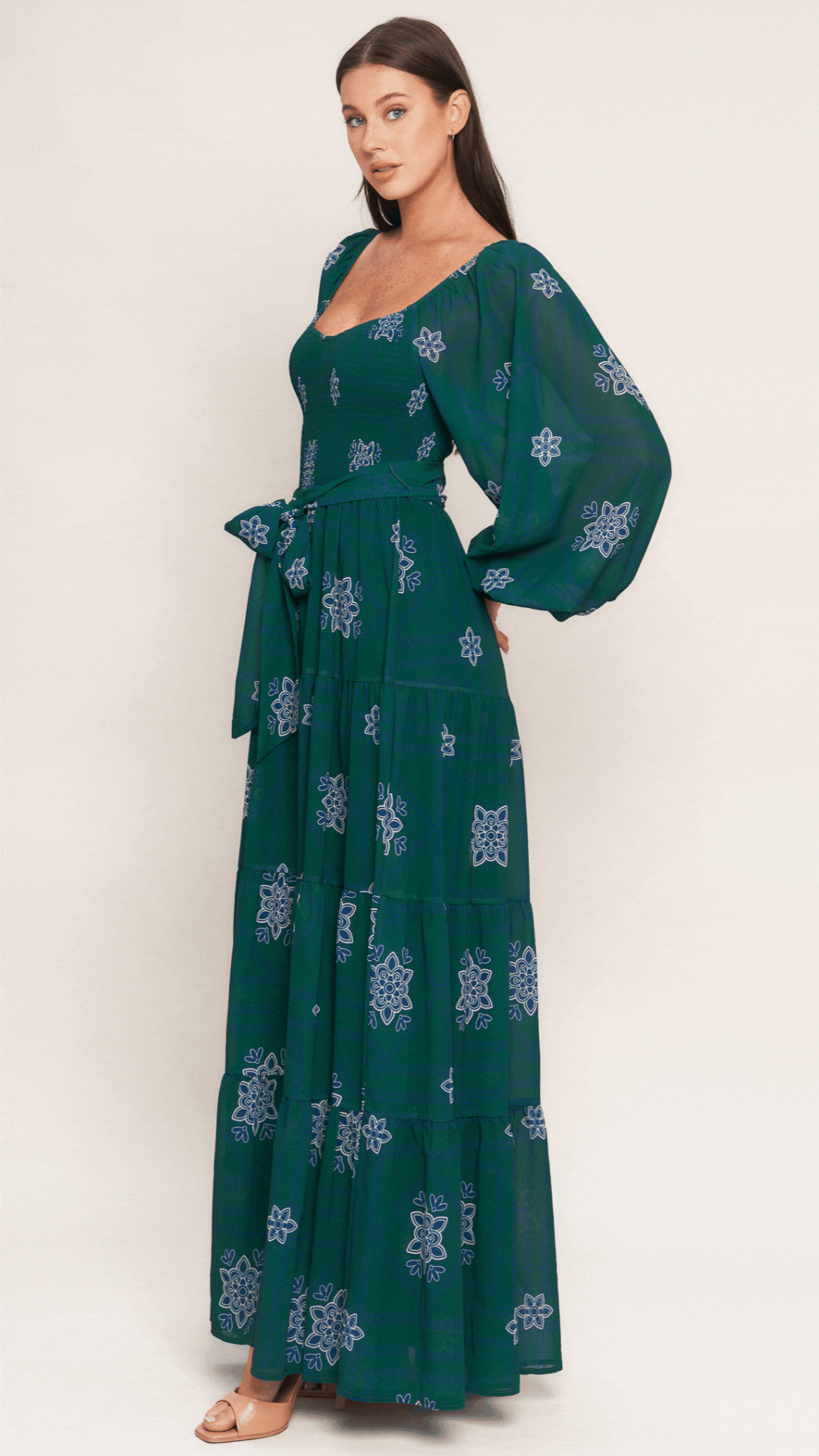 A perfect ode to fall’s earthy elegance, this green maxi dress brings together effortless grace and rustic charm. The billowy long sleeves and smocked bodice create a feminine, flattering fit, while the delicate floral pattern adds a touch of whimsy. Designed with a tiered skirt that flows with every step, it’s ideal for crisp afternoons and golden-hour strolls.