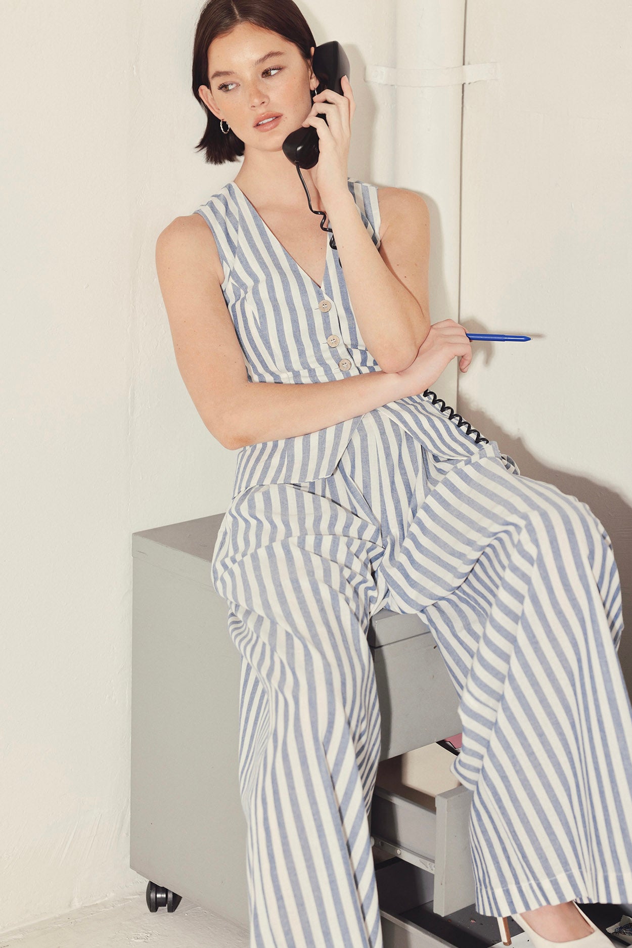Between meetings and messages, modern tailoring keeps the workday moving smoothly. Vertical stripes create clean lines while the vest inspired top adds structure through the torso. Worn together, the set delivers a polished look that feels sharp yet relaxed enough for long hours at the desk.