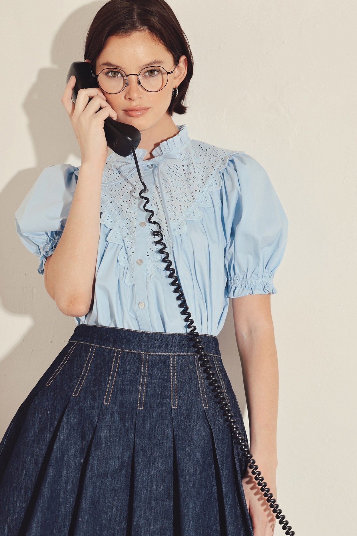 The day begins with a fresh approach to the classic blouse. Delicate eyelet embroidery frames the front panel while soft puff sleeves introduce gentle volume through the shoulders. The relaxed silhouette keeps the look light and breathable, creating an easy piece that pairs effortlessly with tailored skirts or structured separates.
