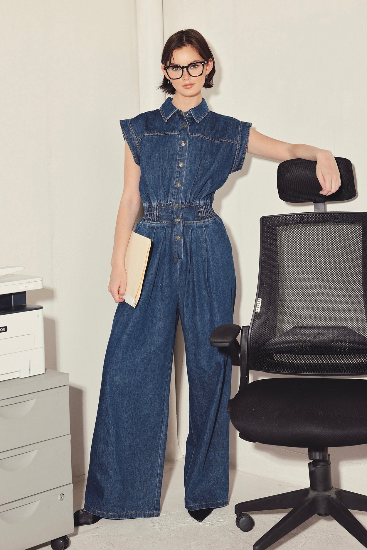 An effortless alternative to traditional workwear. Structured denim gives the jumpsuit a tailored appearance while the sleeveless cut keeps the look relaxed and modern. Worn with simple accessories, it becomes an easy one piece solution for days that move quickly from meetings to after-work plans.