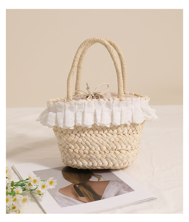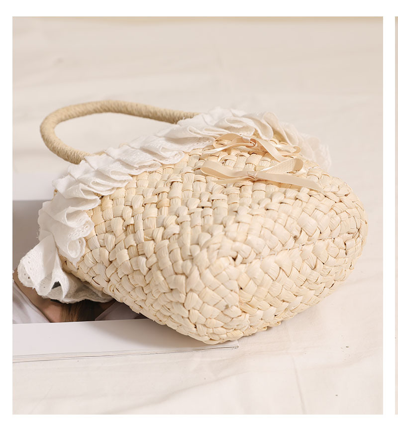 Cute Lace Portable Corn Husk Straw Bag Bow Woven Bag Vacation Beach Bag Hand Carrying Small Basket