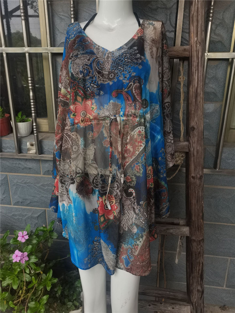 Elastic Mesh Fabric Printed Beach Blouse Sexy Holiday Sunscreen Beach Cover Up