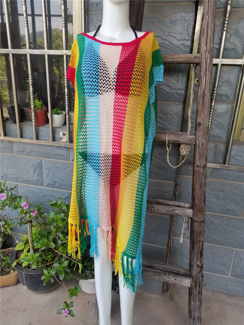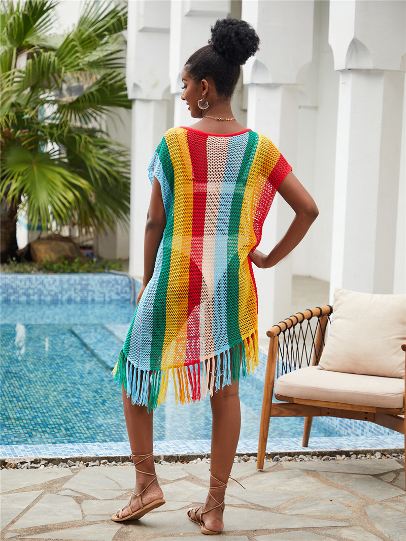 Knitted Striped Beach Blouse Sexy Hollow Out Cutout Tassel Holiday Sun Protection Shirt Beach Cover Up